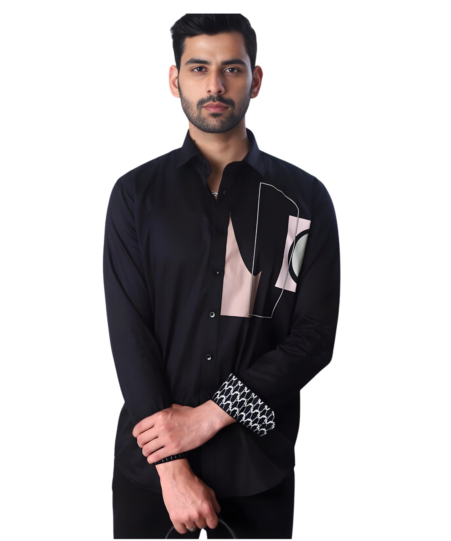 Minimal from the front with a bold artistic print placed at the back, this black shirt brings design and simplicity together. The printed cuff becomes visible when rolled, giving the wearer a second subtle creative element.