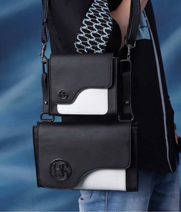 A versatile dual-tone vegan leather bag designed for modern movement. This transformable piece can be worn as a sleek belt bag or elevated as a sling, adapting effortlessly to your day. The two detachable pouches can be used together for added storage or styled separately for lighter carry. With its structured silhouette, contrast panel detailing, and multifunctional design, it brings style and smart utility into one timeless accessory.